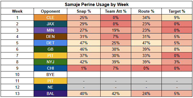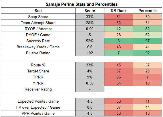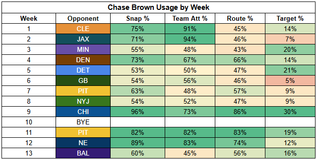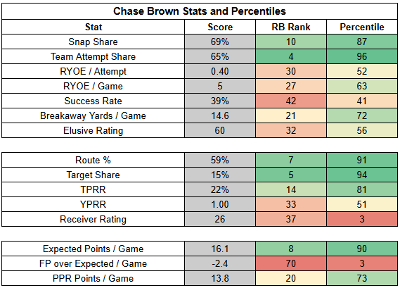 In the backfield, Samaje Perine's return had a major impact on Chase Brown's workload.