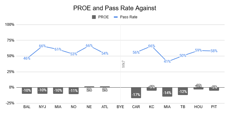 We haven't seen a team post a positive PROE against the Bills since Week 6. And the Patriots, with a 66% pass rate and a 2% PROE, were as pass-heavy as we've seen a team get against Buffalo all season.