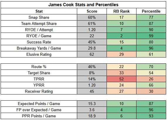 Cook has revived his receiving value a bit, but his rushing workload is still the driving force behind his fantasy value.