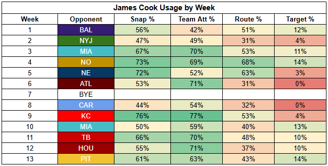 In positive game script, both Allen and James Cook shape up as very strong options.