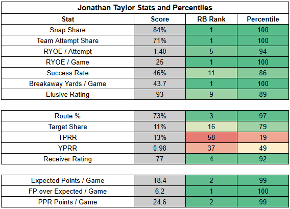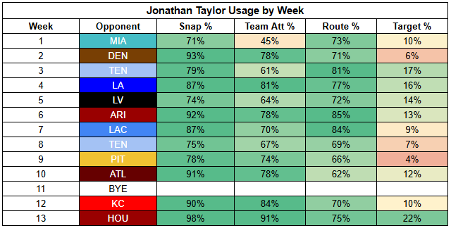 Still, even if the Colts shift back toward the pass here, that's not necessarily a bad thing for Taylor, who has benefitted from defenses needing to respect the pass and the run. And although the Texans held Taylor in check, he operated as the Colts' entire backfield and saw a season-high 22% target share.
