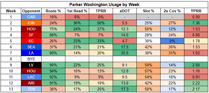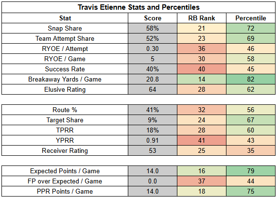 With the Jaguars now profiling as a run-first team, Travis Etienne is set up for a decent workload here. However, Etienne's profile is inherently volatile. He has a poor success rate and a weak receiving role. His value has been tied to big plays and TDs. When he doesn't deliver there, the floor is very flow—as we saw when he turned 12 carries into just 28 scoreless yards (-18 RYOE) and added just one reception for 13 scoreless yards against the Titans.