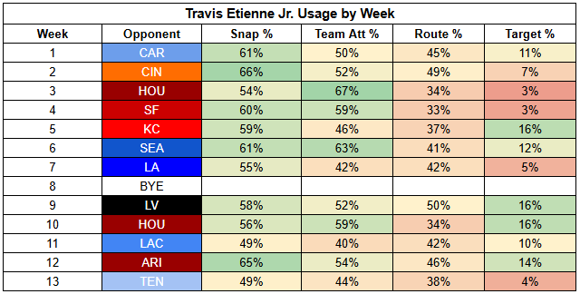 And while Etienne remains the Jaguars' lead back, he's not necessarily in line for a majority of carries here. He's a good bet to have more carries than Bhayshul Tuten, but could still get there with less than 50% of team attempts.