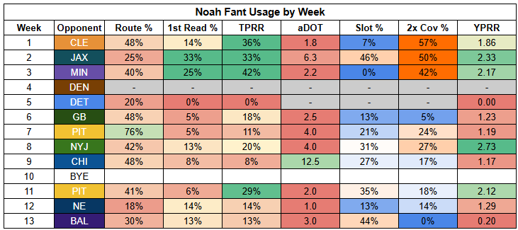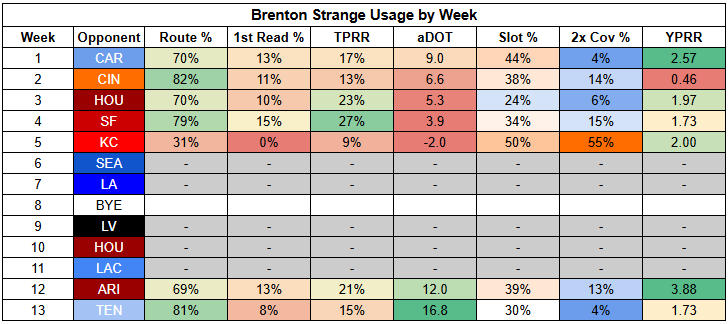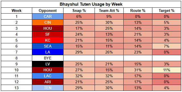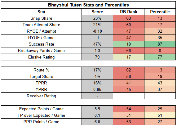 Tuten, meanwhile, has been very consistent this year and has been breaking tackles at a high rate. However, even when it looked like he was breaking out (before injury) against the Chargers, he was only able to force a backfield split rather than a true backfield takeover.