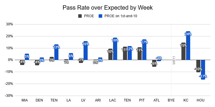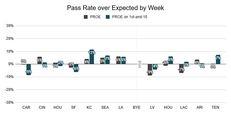 At the same time, the Jaguars haven't fully committed to the run. Against the Titans, they were still willing to pass aggressively on 1st-and-10, and they've only had a negative PROE on 1st down once since their bye.
