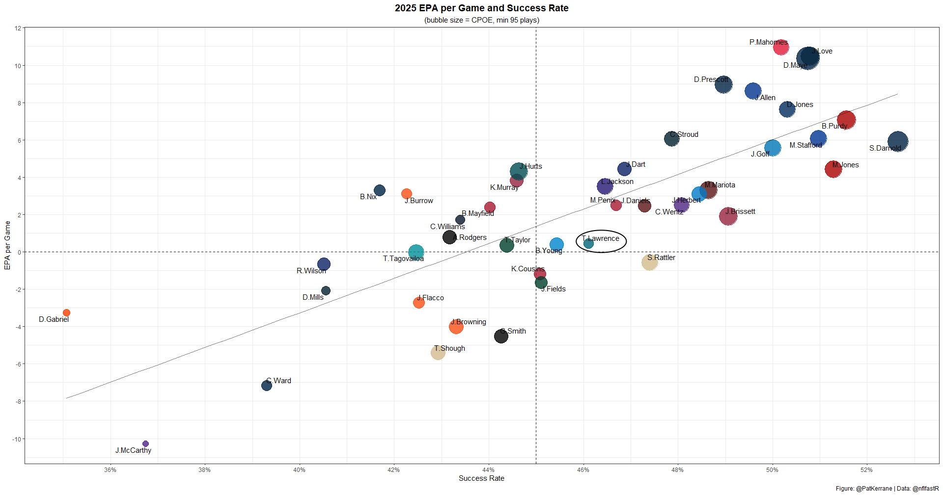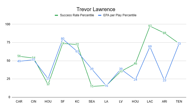 Meanwhile, Trevor Lawrence looks very much like a liability. Lawrence is coming off one of his strongest games of the season, but has been in the 25th percentile or worse in EPA per play on four different occasions this year. He's been below the 40th percentile six times in 12 games.