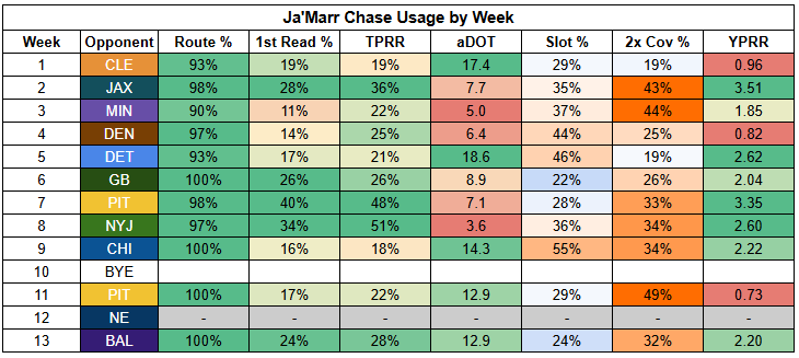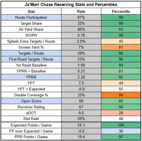 With Higgins now drawing additional defensive attention and providing a deep threat for the offense, Chase has the potential to rack up targets like he did with Flacco... but for those targets to be coming from a truly elite QB. Chase is an elite WR1.