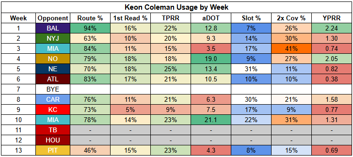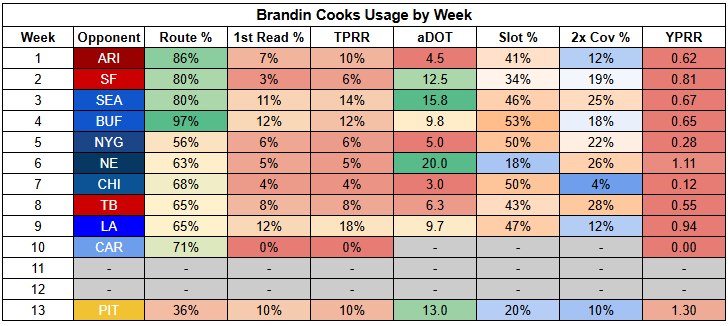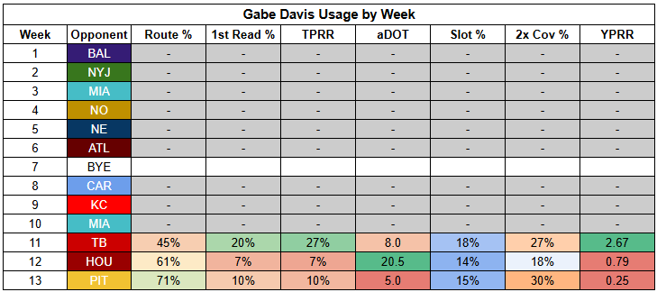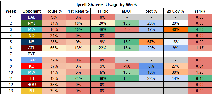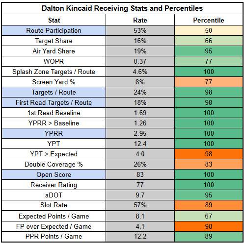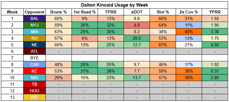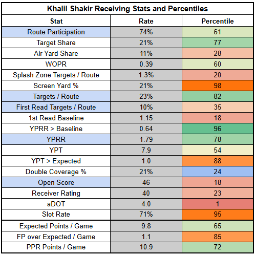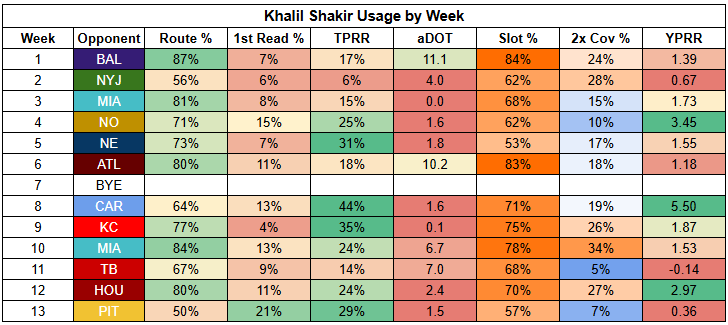 Khalil Shakir is coming off just 50% route participation against the Steelers, which requires elite efficiency to overcome... and he turned in just 0.36 YPRR.