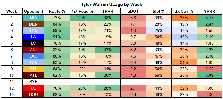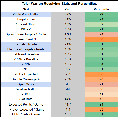 In the passing game, Tyler Warren saved his fantasy day against the Texans with a TD, but turned in a weak 13% TPRR with just 0.96 YPRR.