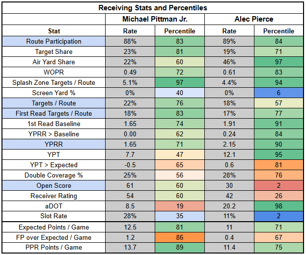 Michael Pittman and Alece Pierce have had very similar profiles this year, with Pittman having an edge as a target earner, but Pierce being significantly more efficient.