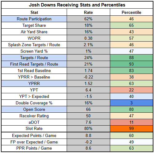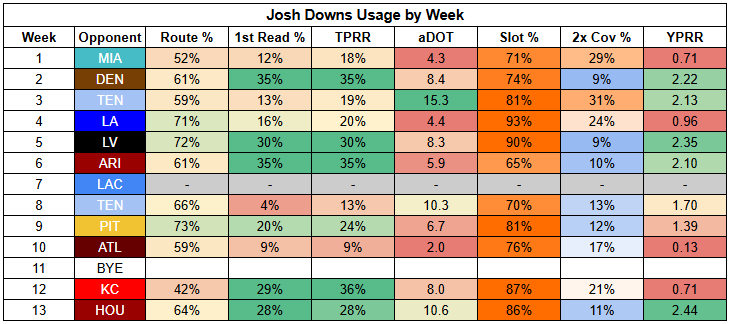 Josh Downs is coming off his most efficient game of the season against the Texans. Unfortunately, he turned in just a 2/44/0 receiving line on five targets. When you only run a route on 64% of dropbacks, them's the breaks.