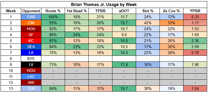 Thomas was back on the field last week, but didn't draw targets. The Titans didn't even bother double-covering him, which is pretty concerning considering his deep route tree.