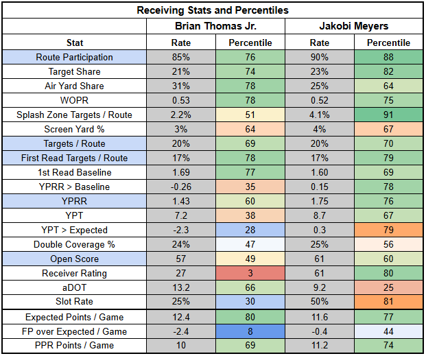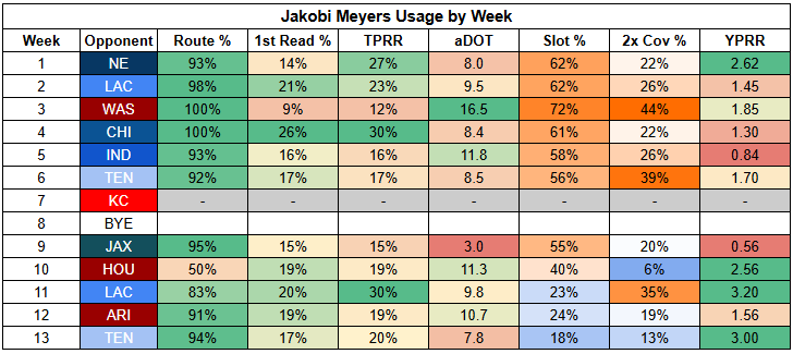 Meyers' profile is pretty mid and is also stronger than Thomas'. With Washington (hip) yet to practice in full this week, both Thomas and Meyers are WR3s. As sad as it is, I slightly prefer Meyers.