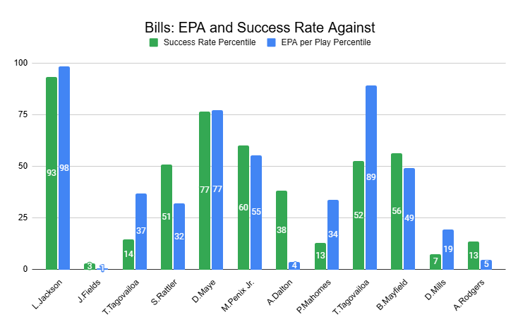The Bills had a major defensive letdown against the Dolphins in Week 10. But even then, Tua Tagovailoa didn't have a strong success rate. Lamar Jackson and Drake Maye are the only QBs to post impressive success rates against the Bills all season.
