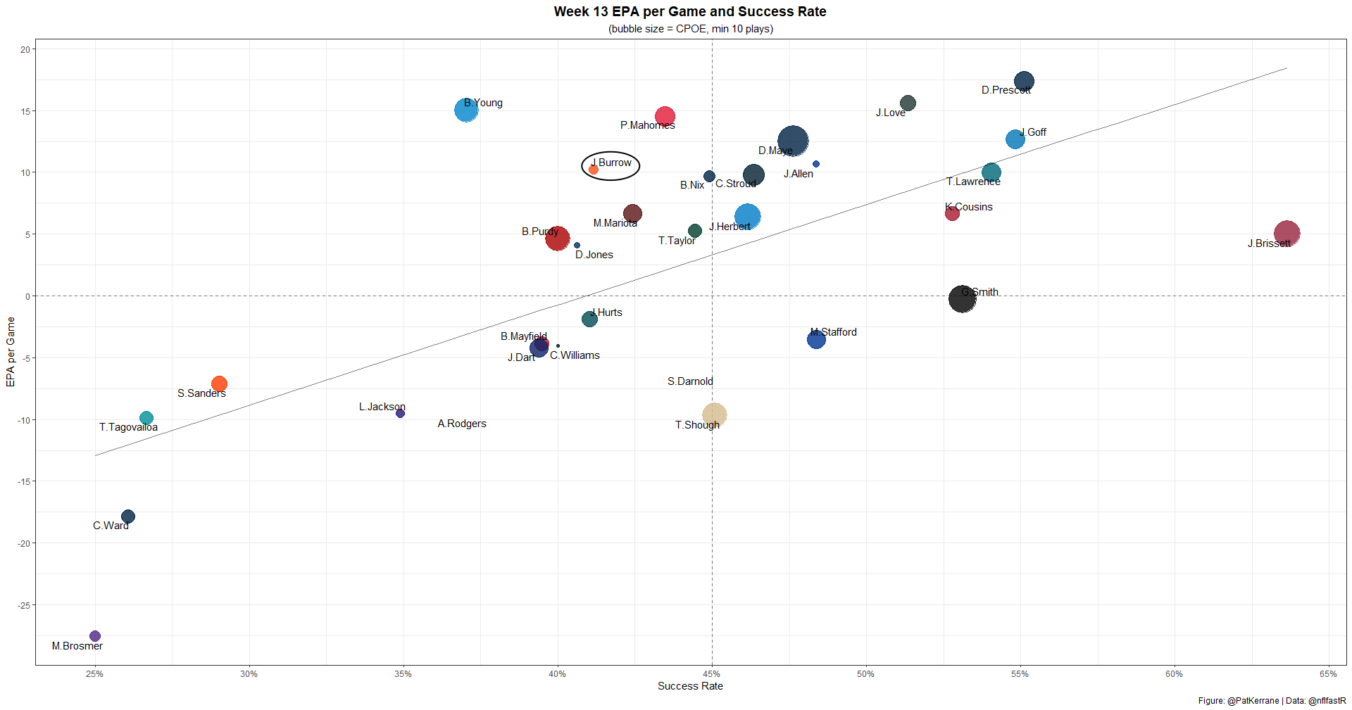 In Joe Burrow's return from injury, he looked... pretty much like Joe Burrow. With 10.2 EPA against the Ravens, he was one of the most efficient QBs of the week.