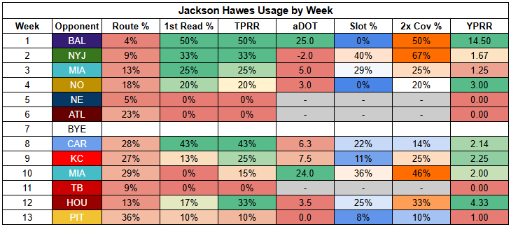 Routes look unpredictable for every Bills WR, including Shakir. However, unlike Shakir, the rest of the Bills' WRs haven't demonstrated target earning or per-route efficiency. We're talking about dart throws, at best.