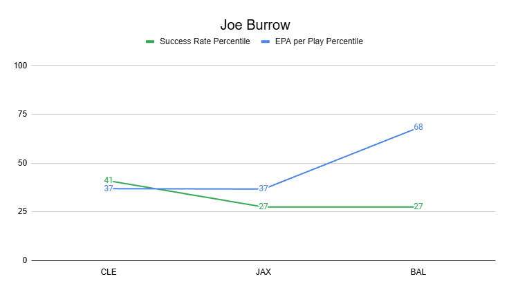 The only fly in the ointment was that Burrow turned in a poor success rate, just like he did in Weeks 1-2.