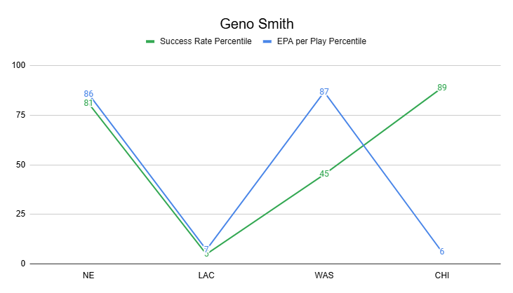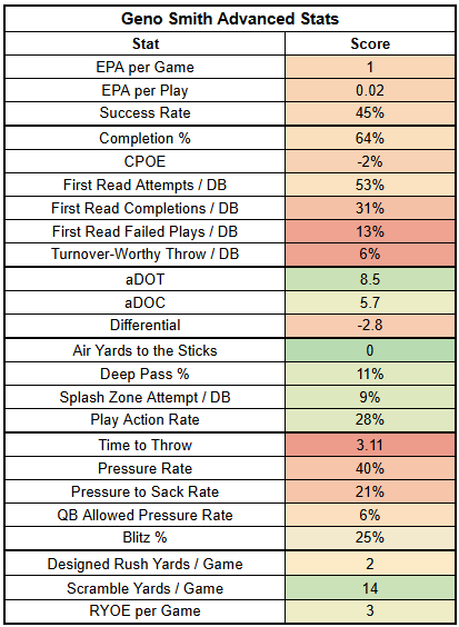 With decent pass protection, Geno Smith turned in his highest success rate of the season. Unfortunately, he also tossed three picks, tanking his efficiency.