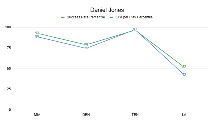 Daniel Jones finally came back down to earth against the Rams. After playing wildly efficiently to open the year, Jones was mediocre last week.