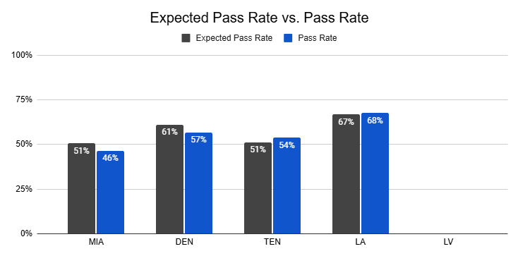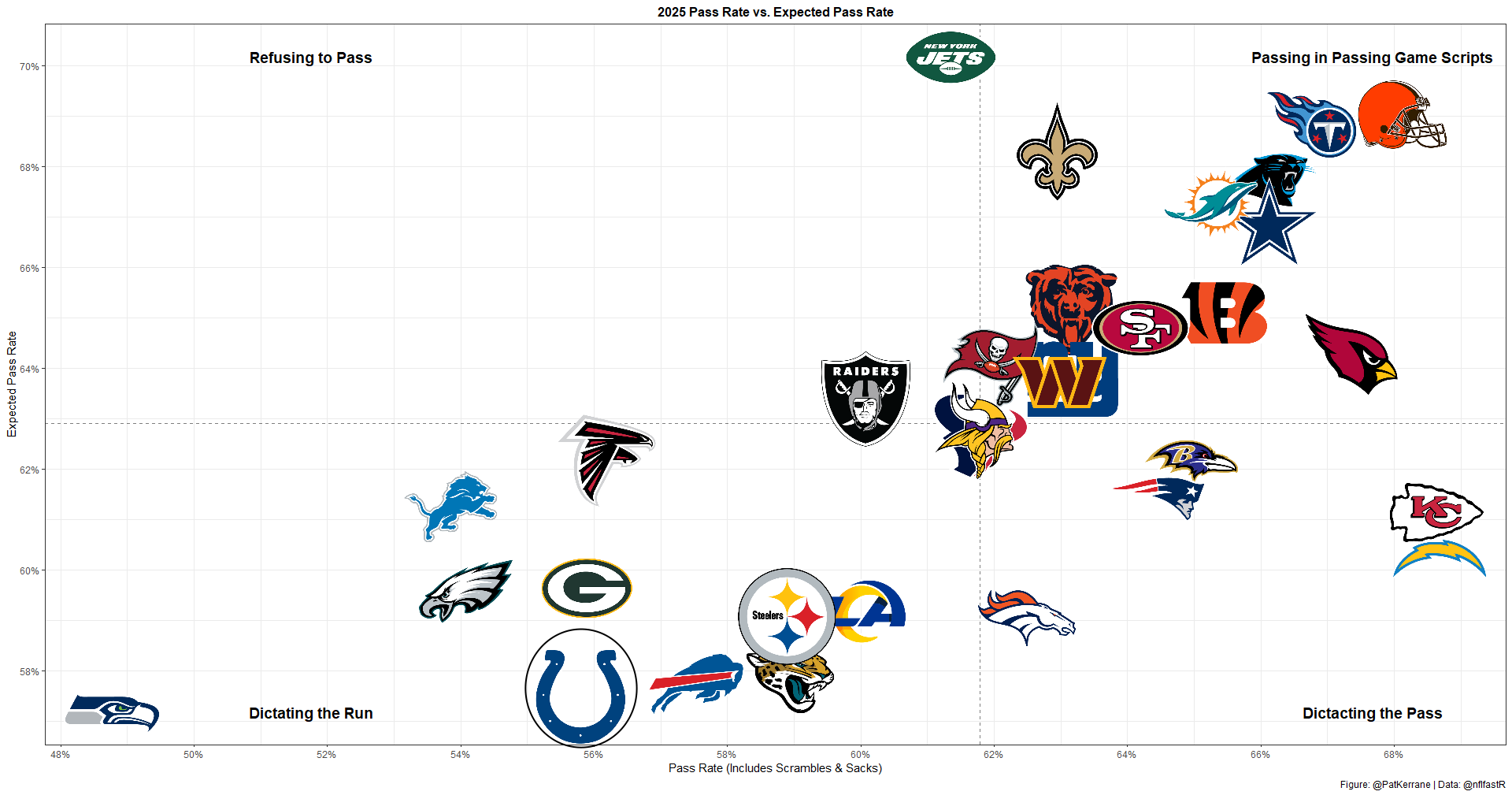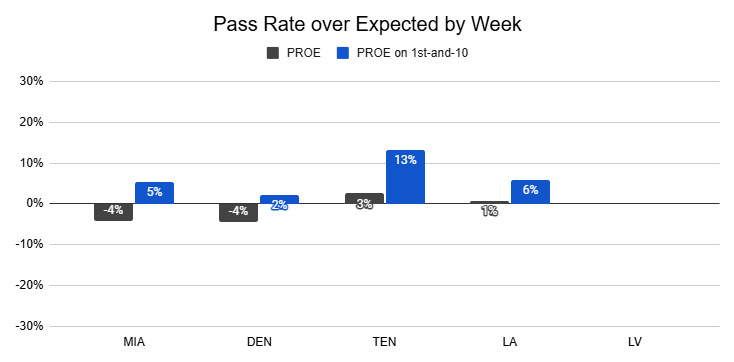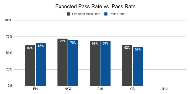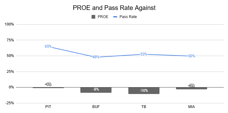 Despite having the highest expected pass rate (70%) in the NFL—a league that includes the Titans and Browns, the Jets rank just 21st in pass rate (61%). Their -9% PROE is the lowest in the NFL.