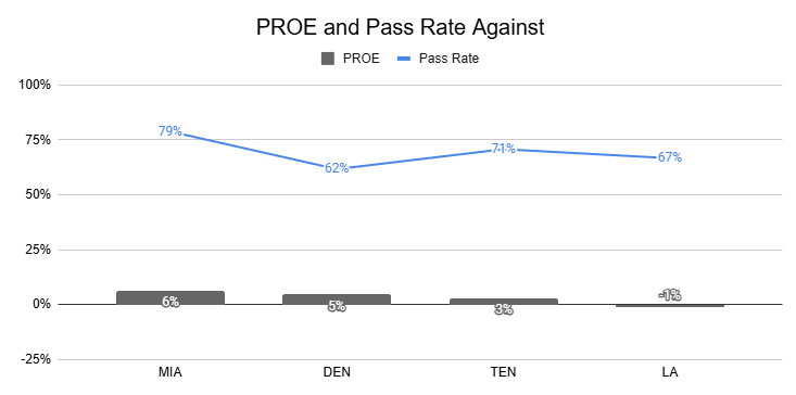 Denver has the lowest pass rate against Indianapolis this year, at just 62%—in line with the 2025 league average. And no opponent has had a PROE lower than -1%.
