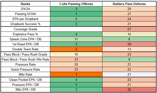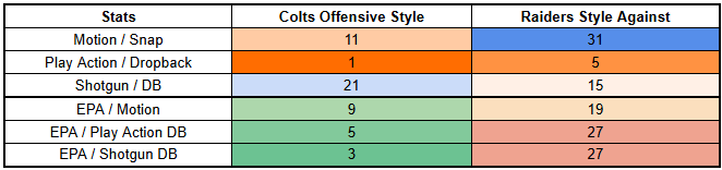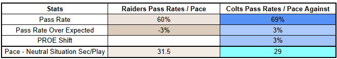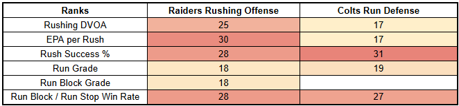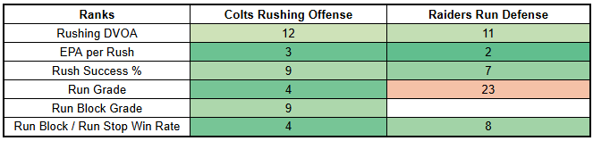 However, the Raiders don't appear likely to build their game plan around the pass. The Colts may be able to push them to the air, but they might have to push hard. Over the last two weeks, the Raiders have pivoted dramatically to the run.
