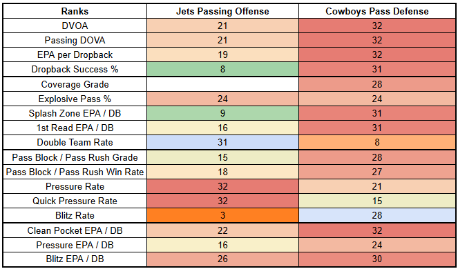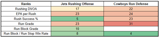 The Jets are an odd matchup, though. On offense, they've been run-heavy and slow, the type of team that seems more interested in playing their style of football than in winning games. This has contributed to them profiling as a run funnel.