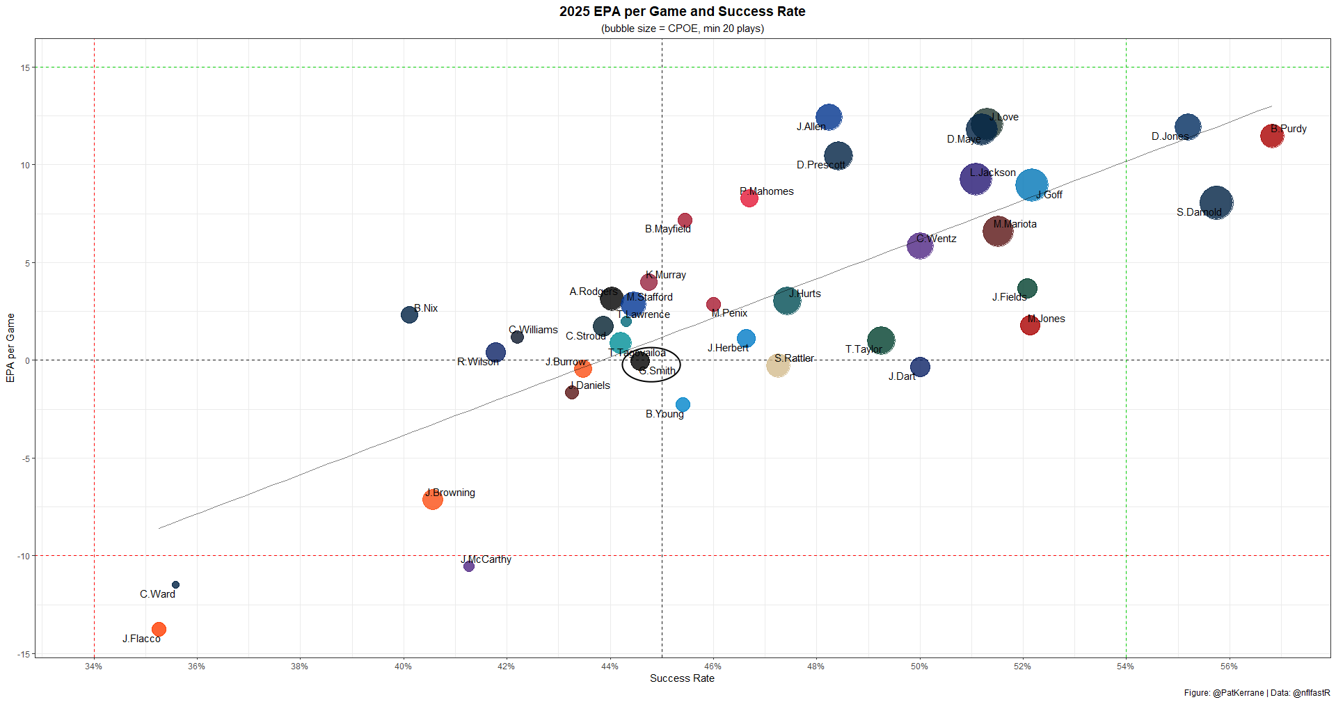 One of Smith's issues is that he's taking a long time to get the ball out. Against a better pass rush than Chicago's—an extremely low bar—we should expect pressure.