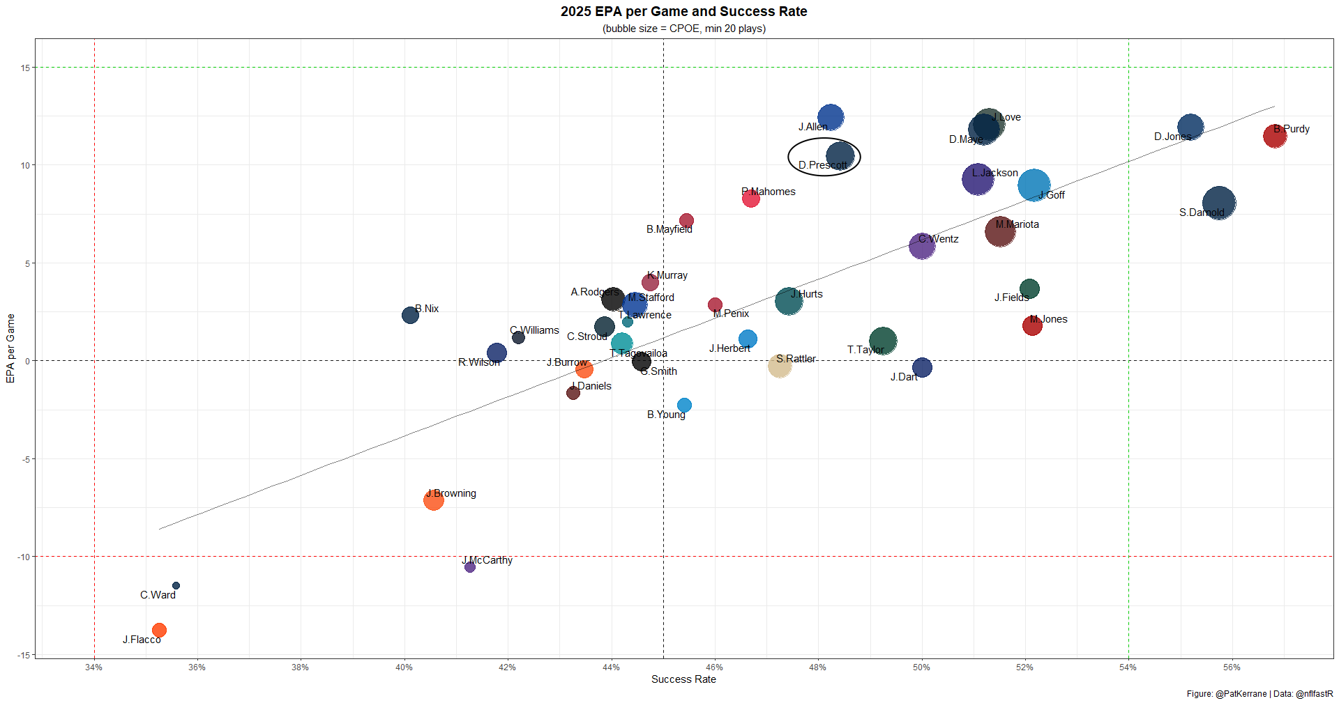 Prescott is now profiling like one of the best QBs in the league, which is where things stood two years ago. Hopes of a 2025 bounce-back year look to be coming to fruition.