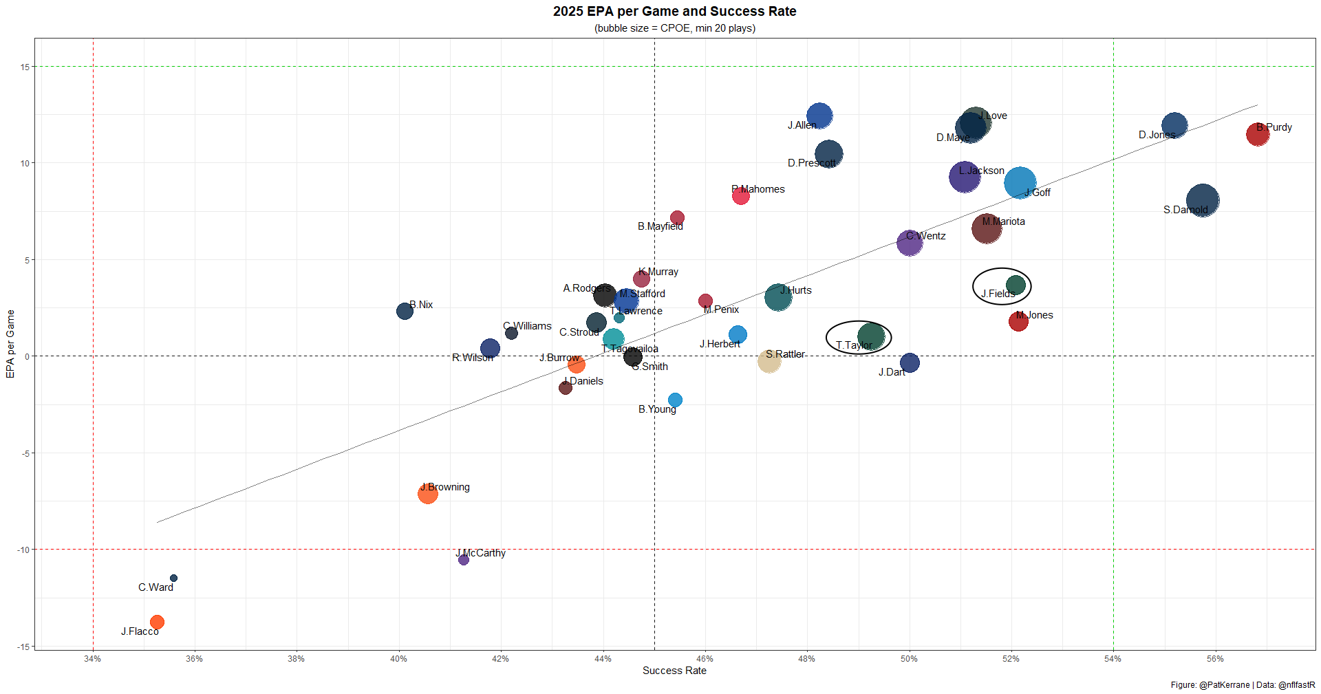 Even without that TD, Fields is profiling like a solidly above-average QB. Fields is in a run-heavy offense, and he's capable of cratering in any given matchup. It's touch-and-go. However, not many QBs can do what he does when playing good football.