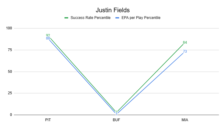 When Justin Fields is playing poorly... there is truly no floor. But the guy has a ceiling. He turned in an impressive fantasy day against the Dolphins, with high-end efficiency.