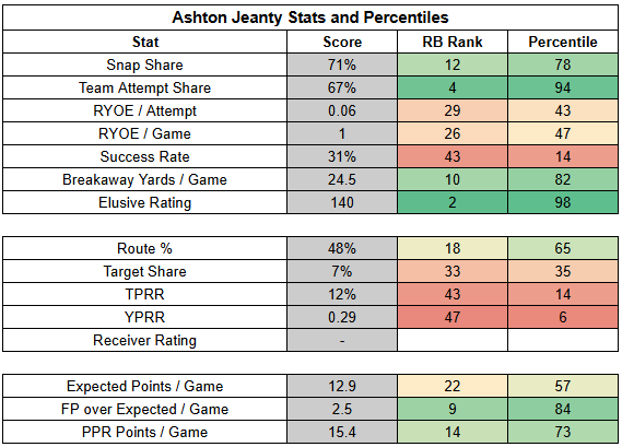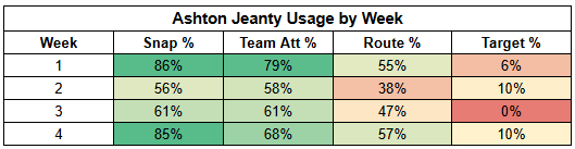 Jeanty's usage was also much stronger in Week 4, after dipping in Weeks 2-3.