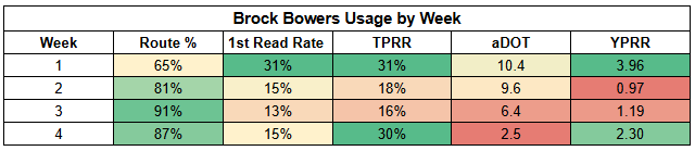 Bowers' route participation has been very strong over the last two weeks. And last week, he spiked to a 30% target share.