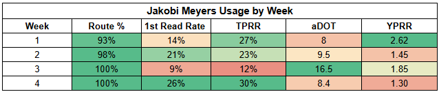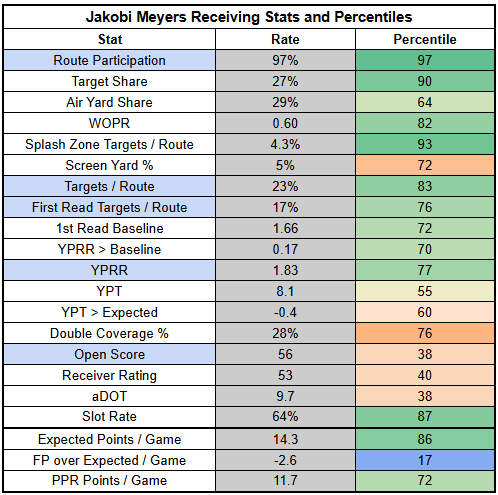 Last week was a real what-could-have-been type of outing for the Raiders. That's especially true for Jakobi Meyers, who turned a 30% TPRR on 100% route participation into just 1.30 YPRR.