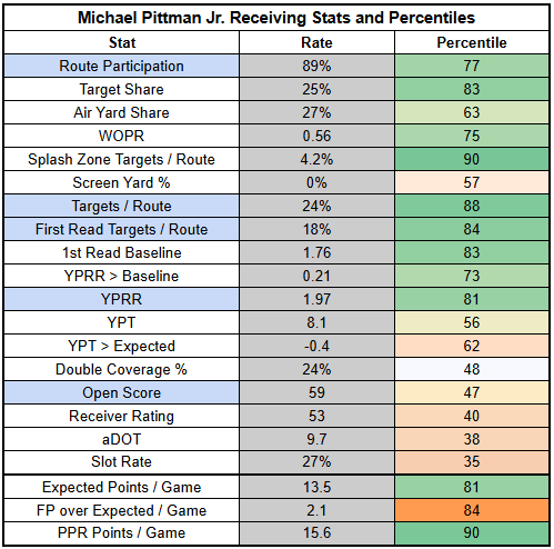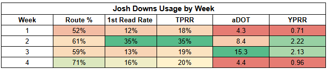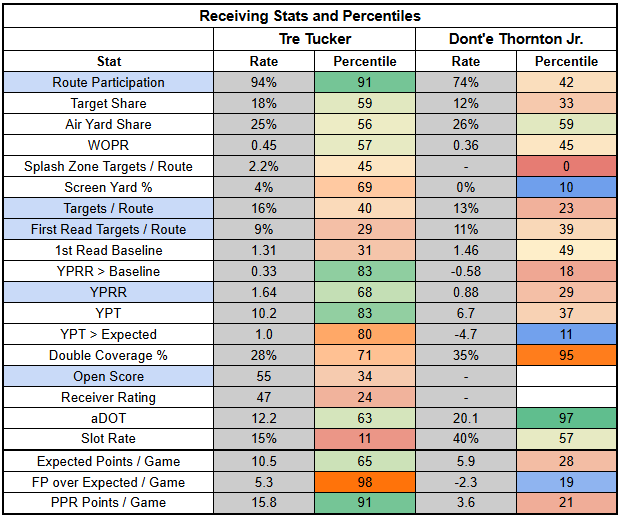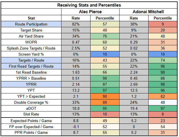 Speaking of missed opportunities. Adonai Mitchell turned in 91% route participation and 3.00 YPRR last week. But he also cost the Colts 14 points, with his fumbled TD and a brutally unnecessary holding penalty that brought back a Jonathan Taylor TD. Even if Alec Pierce isn't back this week—and he probably will be—it's hard to see how Mitchell is anywhere near Shane Steichen's priority list.