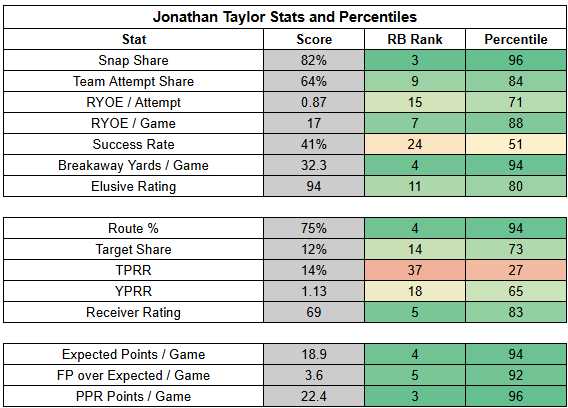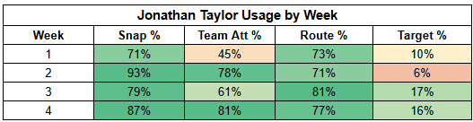 Jonathan Taylor is a very safe bet for rushing volume this week. He's RB3 in snap share and RB9 in carry share, despite missing a decent chunk of Week 1.