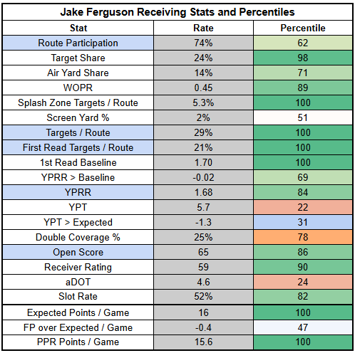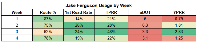 Jake Ferguson is also playing a significant role, but his route tree is currently extremely shallow.