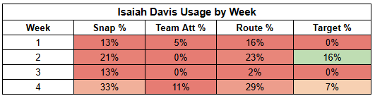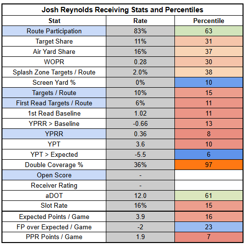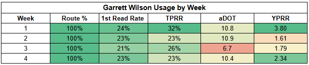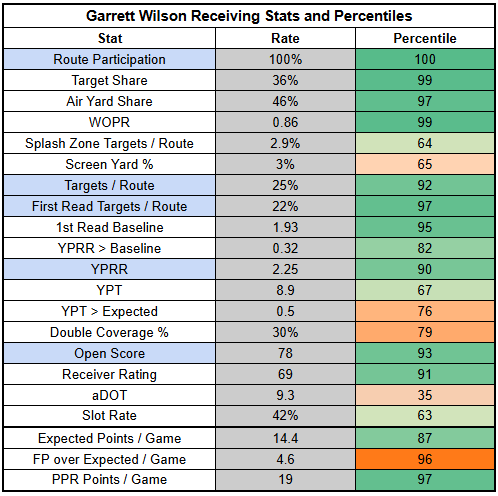 The gap from WR1 to WR2 here is outrageous, and is helping Wilson hit an elite 36% target share.