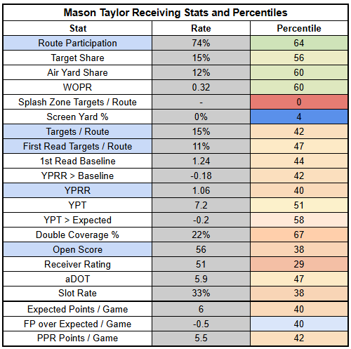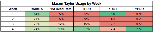 Behind Wilson, Mason Taylor looks like the No. 2 option. He seems to have had a breakout game against the Dolphins.