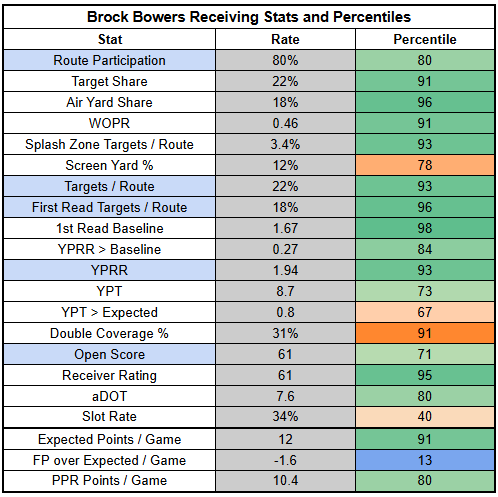Unfortunately, Bowers wasn't earning targets as much as these numbers suggest. Two of his six targets and 59% of his receiving yards came on screens.