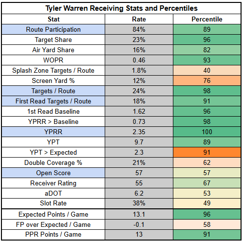 Tyler Warren looks like the strongest play here—by far. He's profiling as a truly elite tight end, and there's no reason to expect that to change here. He's an elite TE1.