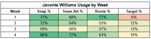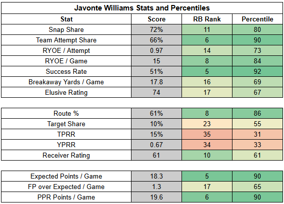 I gotta hand it to Javonte Williams, he's been a lot more efficient this year than I thought possible. However, at the same time, efficiency isn't really the play here. Fundamentally, I still view Williams as a bet on volume. And I don't mean that as a knock. At least, in this matchup, I don't. Williams is coming off elite usage against the Packers and has a very healthy workload this year.