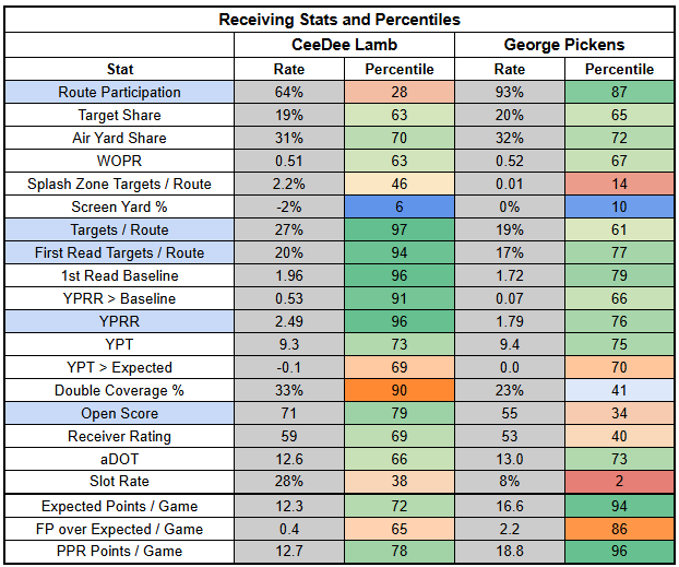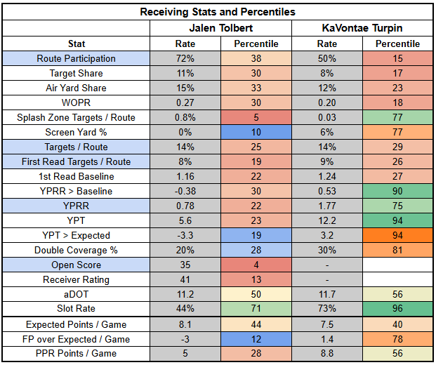 Behind the Cowboys' top two receivers, there's not much to get excited about. KaVontae Turpin is in a true part-time role, and Jalen Tolbert has a very weak per-route profile, including an abysmal open score.