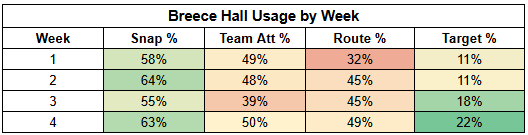 Against the Dolphins, Breece Hall posted a season high in carry share. That's the good news. The bad news is that even with Braelon Allen exiting the game with an injury, Hall was at just 50%, barely above Week 1 or 2.