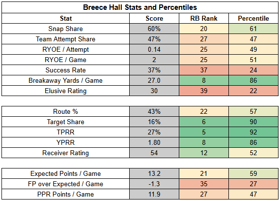 Hall's rushing efficiency has been mediocre this year, but he's been able to hit big run at a decent rate. He's also been excellent in the receiving game.
