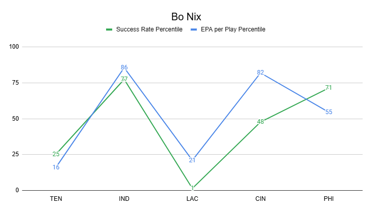 Bo Nix ranks QB22 in EPA per game, but as part of a tightly packed group. He's less than 1.0 EPA per game behind Jayden Daniels, who is QB17. Nix's efficiency has been mediocre, not bad.