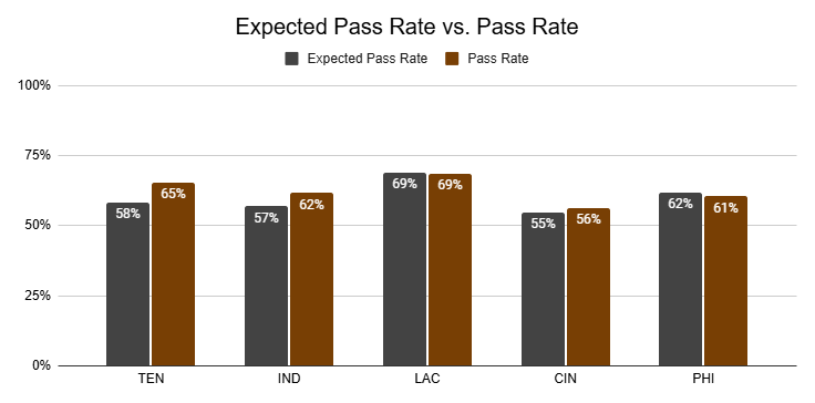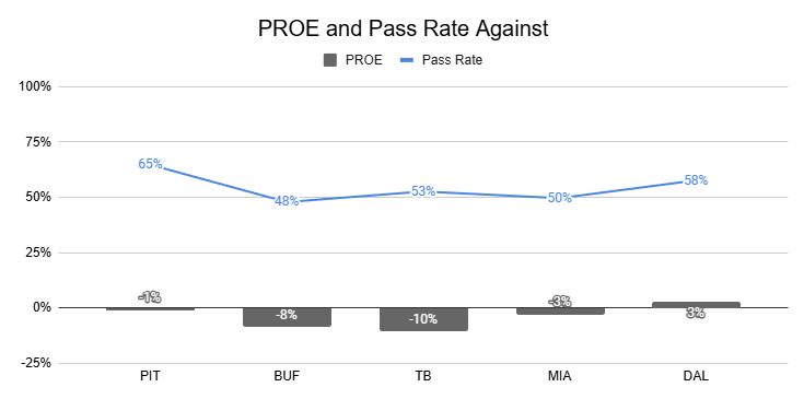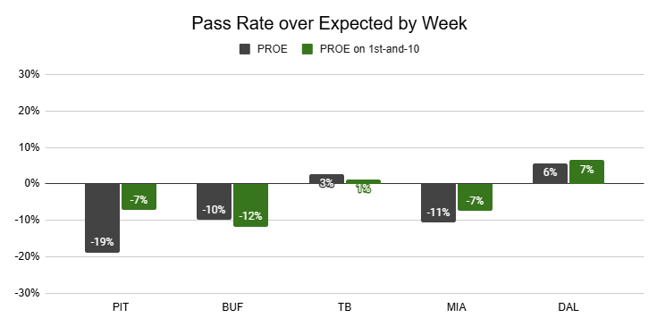 The Broncos have a slight lean to the pass this year, with a 2% PROE. We've also yet to see them really lean into the run in a game this year.