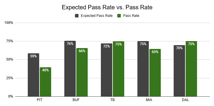 Against the Cowboys, the Jets had a 70% expected pass rate, matching their season average—which is absurd. For the first time with Fields, they leaned into the negative game script, posting a 75% pass rate.