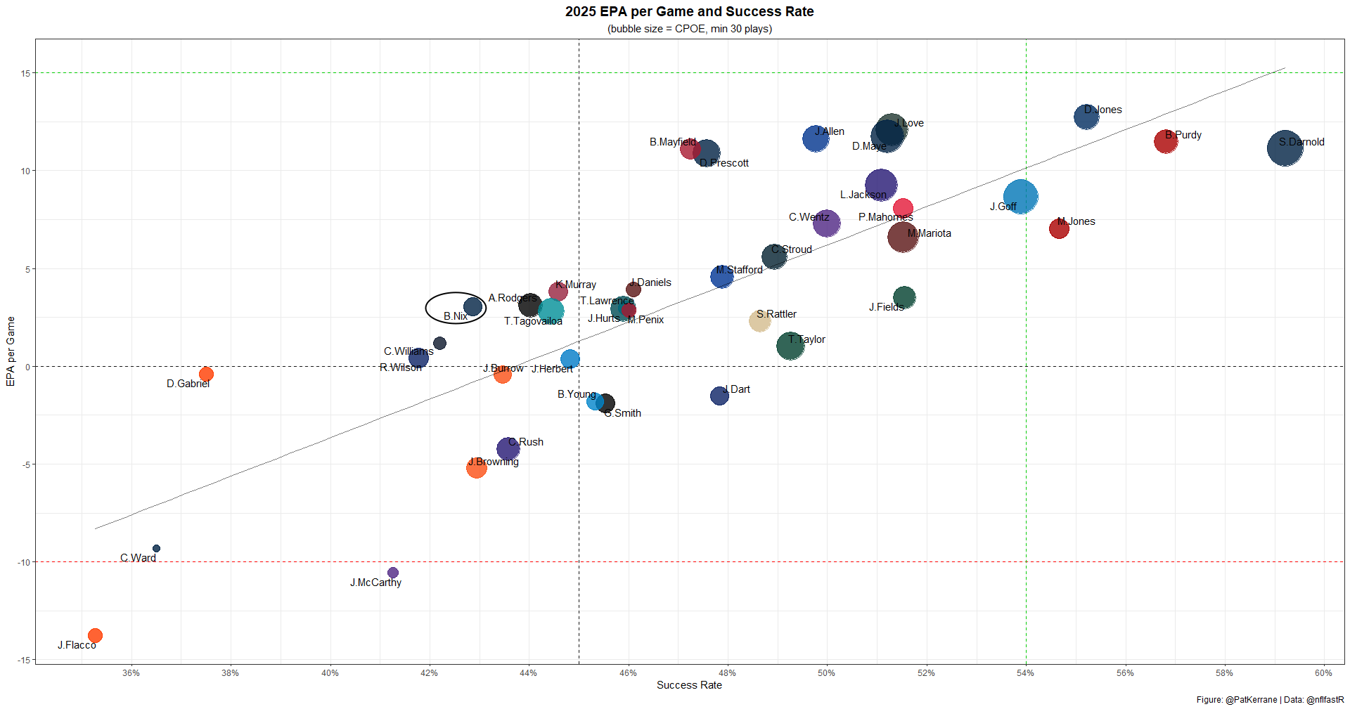 But in success rate, Nix ranks QB34, behind Cooper Rush and Jake Browning and ahead of only Caleb Williams, Russell Wilson, JJ McCarthy, Dillon Gabriel, Cam Ward, and Joe Flacco. Nix's success rate is a significant concern because between it and EPA, success rate is the the more likely of the two to be telling the real story. Put another way, Nix is a negative regression candidate.