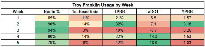 Troy Franklin's routes aren't as locked in as Sutton's, but he's settled into a near-full-time role.